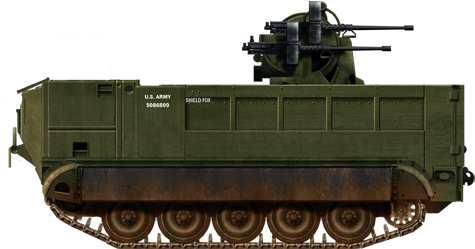 The original M113 chassis had a light weight frame enabling the use of a relatively small engine which was in the first version developed in 1959, a 6V53 Detroit two-stroke six cylinder diesel, coupled with an Allison TX-100-1 three-speed automatic transmission. The final vehicle presented itself with a M113 base chassis and drivetrain, with front drive sprocket, rear idler, five roadwheels, but a brand new hull partly in aluminium was buiot over it. The engine was relocated under a tall hood in a COE configuration (Cab over Engine) with a classic glassed cabin featuring a three-framed front windshield, all folding forward, canvas doors with plastic windows and a removable tarpaulin. The cab hatch cover on top closed the MG-gunner position.