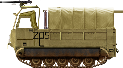 -Raupentransportwagen 68/05 ammunition transporter, supplying the M109 Swiss Kawest howitzer. It is also used by the tank mortar unit 16/5, with ten pallets of eight 155 mm charges and detonators handled by an electric hoist.