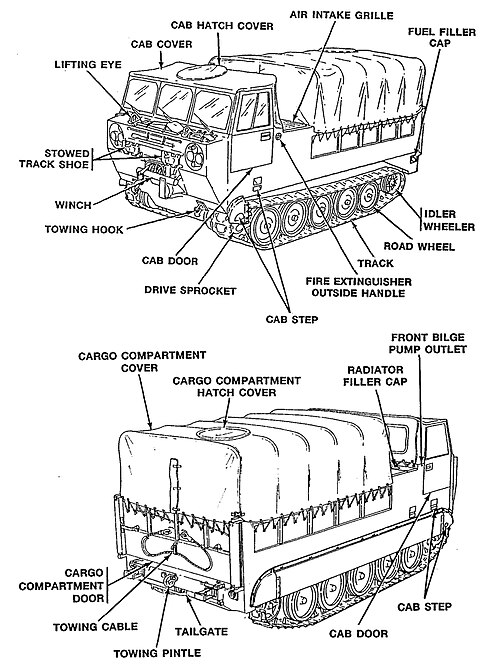 1. Lifting eye. 2. Cab cover. 3. Cab hatch cover. 4. Aft bilge pump outlet. 5. Air intake grille. 6. Fire extinguisher outside handle. 7. Fuel filler cap. 8. Idler wheel. 9. Road wheel. 10. Track. 11. Cab door. 12. Cab step. 13. Drive sprocket. 14. Towing eye. 15. Winch. 16. Spare track shoe. (Picture from TM 9-2350-247-10 Driver's Operation and Maintenance Manual Carrier, Cargo, Tracked, 6-ton: M548 (2350-00-078-4545).)