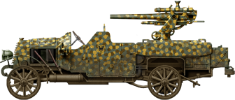 A 77 mm Leichte Kraftwagengeschütze M.1914 of A.O.K. 2 / K. Flak 36 (2nd Army Command, 36th Motorized Anti-Aircraft Detachment) in France, 1917. The vehicle is painted in a patchwork camouflage scheme of yellow ochre, brown, green-grey, and field grey. Note the unit designator (Formationszeichen) painted on the bonnet used by the Imperial Army between February 1915 and August 1917.