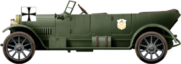 Mercedes (1915), belonging to the Imperial Volunteer Automobile Corps (Kaiserlichen-Freiwilligen-Automobil-Corps), operating within the Empire's territory, were authorized to display registration plates with numbers painted in red. They were further identified by a special sign affixed adjacent to the rear registration plate. This sign took the form of a red square plate measuring 12 x 12 cm, with a yellow square placed in the center bearing the letters "K.F.A.C." in each of the four corners. K.F.A.C. vehicles operating in the rear sectors of the frontline were painted green-grey (Feldgrau) and marked with two broad crimson stripes on the body and hood/bonnet.
