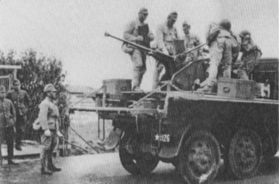 This consisted of the Type 98 20 mm AA machine cannon mounted on the back of a Type 94 six-wheeled truck. The Type 98 20 mm AA autocannon was the most common light anti-aircraft gun of the Imperial Japanese Army, with a range of 5,500 meters, an altitude ceiling of 3,500 meters, and a rate of fire of up to 300 rounds per minute. The gun could be fired from the rear platform of the truck or unloaded and fired from the ground. These carrier trucks were deployed in the air defense units of the four Japanese tank divisions.