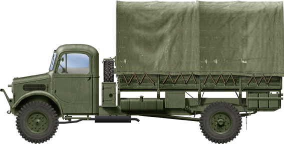The Bedford OY was a slighlty modified commercial design ready for service, with a simplified bodywork, single rear tires of military off-road type. Early-war models had wooden rear bodies to spare strategic materials, but during the war they swapped to metal panels. The three-ton truck OYD totalled more than 72,000, to compare to 250,000 twhich was the global war effort from Bedford for trucks alone. Production started al Luton in early 1940 as soon as the contracts were signed.
