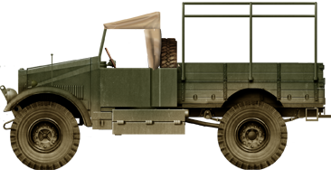 The cab was still open top, with a frame resting on the forward folwing windshield that can be removed entirely and a rear fat bed with steel frames but wooden panels, folding back plate, three arches to mount a tarpaulin. In winter when the cab tarpauling was mounted, canvas plastic windows could be added to fully enclose the cab. Behind it was located the spare wheel, with some space on the right to install a jerrycan. Like the CS8 Mark III there was a large storage box below the side doors. Nor armour nor armament, and unlike the CS8 which windshield could be foldded down to lay a Bren MG or Boys AT rifle manned by the co-driver, there was not such option on the C4. Its rear flatbed could accomodate six infantrymen with their gear. Towing capacity was enough for light ordnances such as the ubiquitous 2-pdr AT gun.