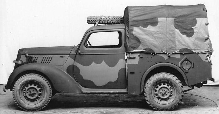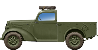 An adaptation of each model was necessary to a military Utility specification. It varied in detail but the standard was identical. The rear body was cut out and replaced by a flatbed, to create a small pickup truck, with canvas roof cover. It was called the "tilt". Thus, from 5 seates, the vehicle became a 2-3 seaters confined into the forward cab. The bodywork was simplified for mass production but the cab remained all metal. There were adaptations, with some models adopting simpler, angular flat-panel wings or doors. Cast or moulded body parts were also replaced by simpler pressed-steel stampings. Chrome were not applied and replaced by military paint, notably on the grille and bumpers.